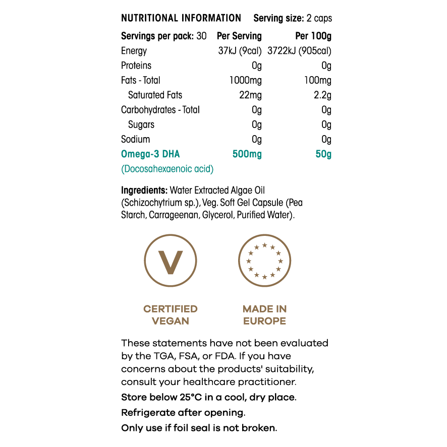 - 100% pure algal oil (50% DHA)